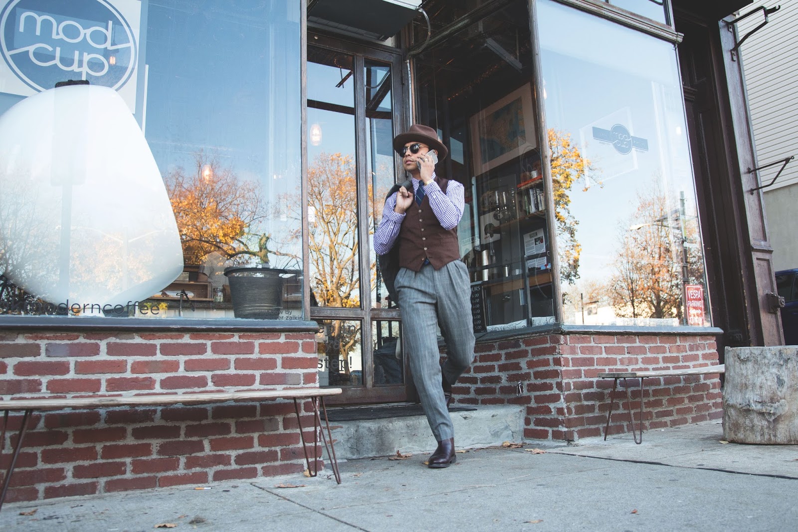 For my first look, I started with the herringbone printed case. Herringbone is a classic textile and called for a look that showcased a dandy man in the modern world. A dandy is a fellow who never shies away from embracing bold prints and tailored fits but does so without trying too hard. I decided to contrast my herringbone case with a gingham button down in an effort to be playful with prints that both clash and compliment one another. By doing so, I achieved a look in which I felt confident and polished, but also showed that I was having fun.